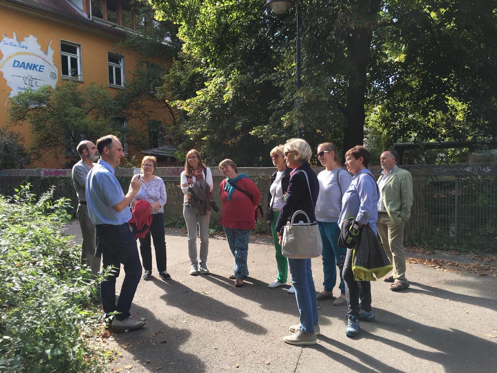 Pastoralreferent Michael Hartmann zeigte der Gruppe Ansatzpunkte von Kirche der Zukunft bei einem Rundgang durch den Freiburger sozial-ökologischen Vorzeigestadtteil Vauban. In diesem Stadtteil ist der Anteil der praktizierenden Christ(inn)en gering, es gibt keine gebaute Kirche, sondern ökumenisch genutzte Kirchenräume vergleichbar einem Kirchenladen. Die Kirche im Vauban ist in diesen Räumen Gastgeber/Herberge für suchende Menschen. Im Stadtteil wird sie wahrgenommen, wenn sie sich z.B. als Mediator bei Stadtteilkonflikten einsetzt. Michael Hartmann wurde als Verantwortlicher für Kirche im Vauban Experte für neue Kirchenentwicklungen. Die Einblicke, die er gegeben hat, waren für die Teilnehmenden sehr kostbar, sie haben das Engagement der Caritas-Konferenzen, nah am Menschen, in ihren Pfarreien bestätigt. Es war wie ein Besuch "bei Verwandten".